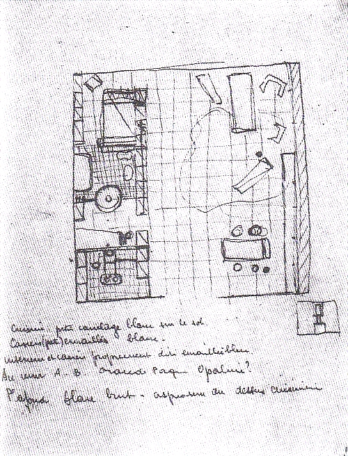 „Die Zuflucht der Familie, der häusliche Herd. Man kommt von draussen (1) herein(2). Hier findet man den traditionellen „Herd“, der schon in der Antike Mittelpunkt des häuslichen Lebens war. Die Hausfrau bereitet an ihm die Nahrung, umgeben von ihrer Familie. Sie sind alle um den „Herd“ versammelt und verbringen hier die Zeiten des Tages, die seit jeher dem Familienleben gewidmet waren: Die Mahlzeiten(3). Küche und Aufenthaltsraum bilden eine Einheit. […] Die der ganzen Familie dienenden Einrichtungen sind zusammengefasst: Duschen, Badezimmer, W.C., Schränke für die Winter-und Sommerkleider, Glätteeinrichtung (5 und 8). Hinter einer Türe (6) liegt das Elternschafzimmer, hinter zwei Türen (7) die Kinderzimmer mit einem oder zwei Betten; die beiden hinter einem Sonnenbrecher liegenden Räume können durch Verschieben der beweglichen Trennwand vereinigt werden. Auch sie sind gegen Sonne und Landschaft geöffnet. So kann der Plan einer „Wohnmaschine“ beschaffen sein.“